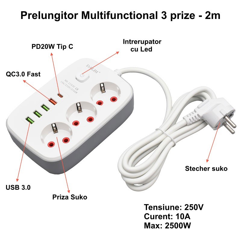 Prelungitor Multifunctional 3 Prize cu 4 Usb 2M cu urmatoarele caracteristici :